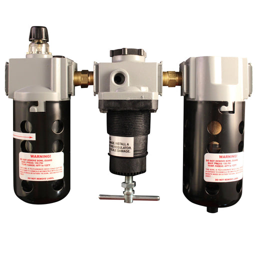 1/2" NPT deluxe FRL trio is a filter, regulator and lubricator all in one. The filter has an automatic overnight drain, the regulator is the reliev...